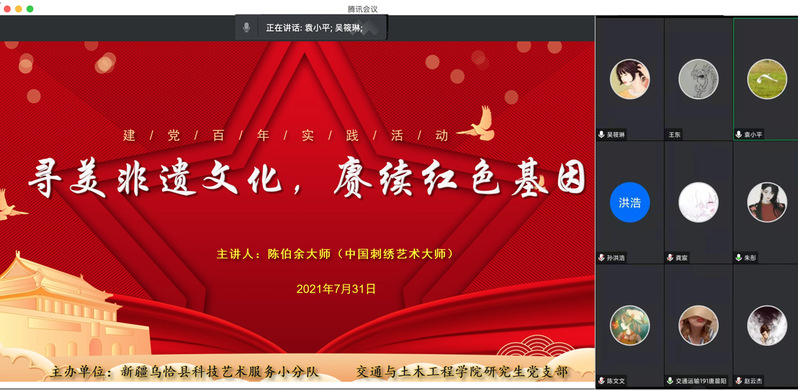 此次活动是学院新疆乌恰县科技艺术服务小分队暑期社会实践活动和研究生党支部党史学习教育系列活动之一,旨在让青年学子们走进发绣技艺、感受非遗魅力、传承优秀文化、弘扬工匠精神、汲取奋进力量,并在今后的人生道路上,充分发挥自身的特有优势,力所能及地保护和传承非物质文化,让更多的文化遗产“活起来”,将其发扬光大、永久传承。