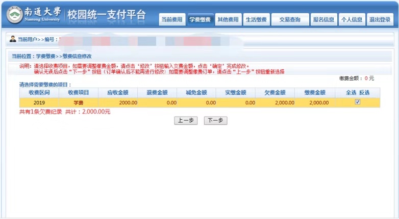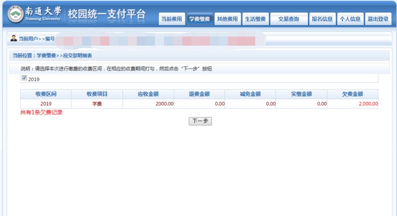 点击页面右上方“学费缴费”-----核对页面缴费信息----点击下一步