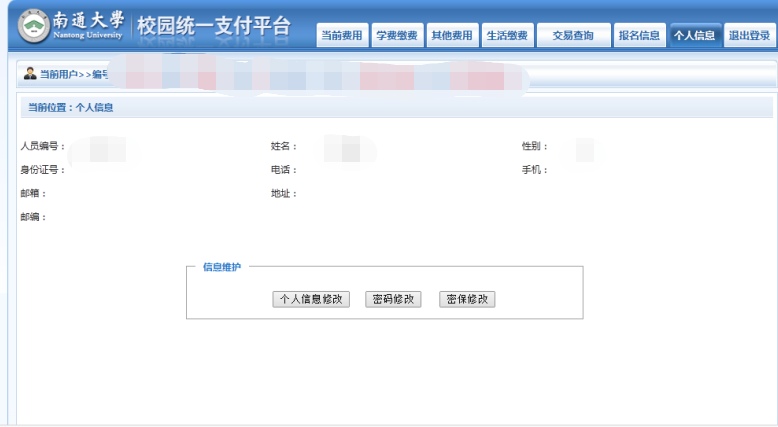 点击页面右上方“个人信息”---核对本人身份证号码信息(须确保身份证号码正确,后续将凭借身份证号码获取电子发票),需要修改密码的可以进行密码修改,建议设置简单易记的密码;