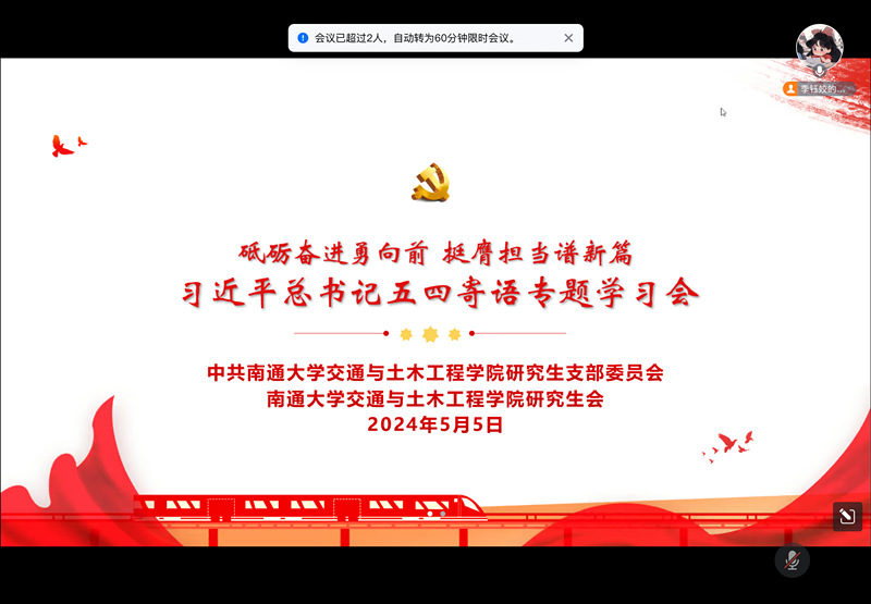 院研究生党支部宣传委员季钰姣领学了总书记五四寄语,倡议大家时刻听从党和人民的召唤,在科学研究和创新报国等方面勇当排头兵和生力军,更加自信自强、刚健有为,展现新时代交土学子的风采。